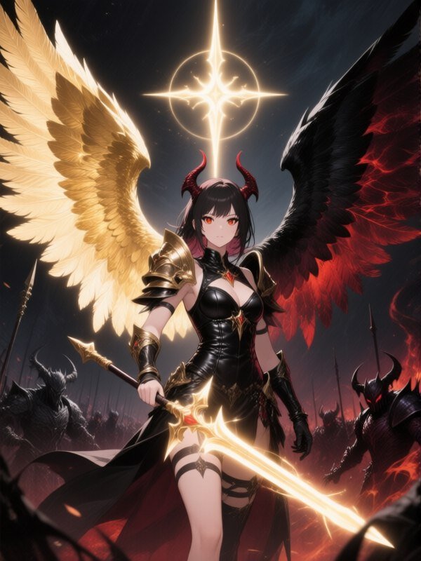 Изображение представляет собой мощный и противоречивый образ женщины, сочетающей в себе черты демонического лорда и носительницы божественного света. Она предстает как могущественная повелительница, окруженная аурой одновременно небесного сияния и адского пламени. Её крылья - яркий контраст: одна сторона золотая, символизирующая божественность, а другая – черная кожа, олицетворяющая власть тьмы. В руках она держит копьё, излучающее свет и способное изгонять тени.