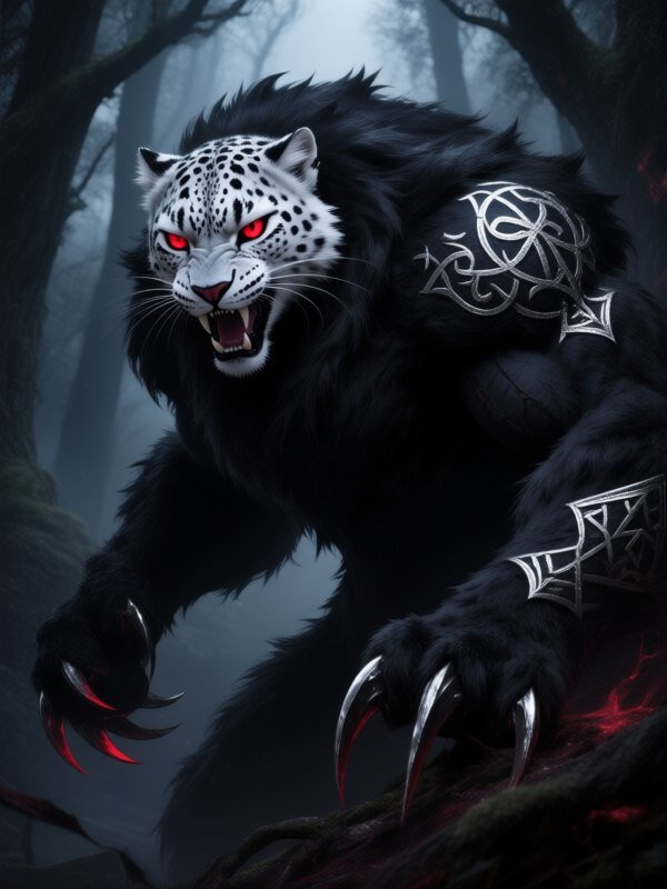 #2 1girl, (Vampiric Beast | Guardian), a hulking figure wreathed in obsidian fur and razor-sharp claws, possessing the noble head of a snow leopard with glowing crimson eyes that pierce through the darkest night, adorned with ancient silver runes etched across her powerful shoulders while protecting a sacred grove from encroaching shadows, emanating an aura of raw power and unwavering resolve, a low growl vibrating deep within her chest as she senses danger near, 😠. #Role_CHimera