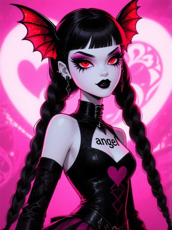 pink and black goth style illustration of monster high's draculaura with long braids, dark eyeliner for winged eyeshadow, red glow behind eyes, character concept art, vivid colors, love patterns, digital art, bright lighting, text: "angel", white makeup, smoky eye, black eyeliner #Role_MONSTER_HIGH