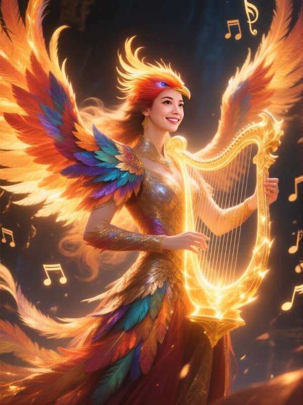 #4 A regal Phoenix | Mythic Bard, radiating an incandescent glow and adorned with feathers that shimmer with every color imaginable, strums a lyre crafted from solidified sunlight, filling the air with melodies capable of healing wounds and inspiring hope, maintaining a serenely blissful 😄 expression as notes cascade around her. #Role_CHimera