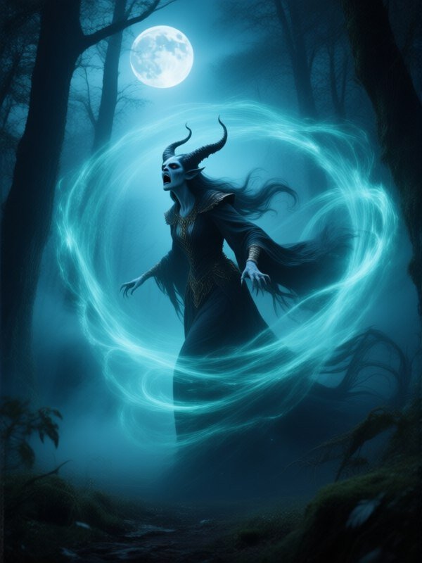 #3 A fierce Banshee | Spirit Guide, manifested as a swirling vortex of ethereal energy interwoven with strands of mournful mist, drifts through a moonlit forest, its voice echoing with the sorrow of ages yet offering guidance to lost souls, exhibiting a quietly contemplative 🤔 look. #Role_CHimera
