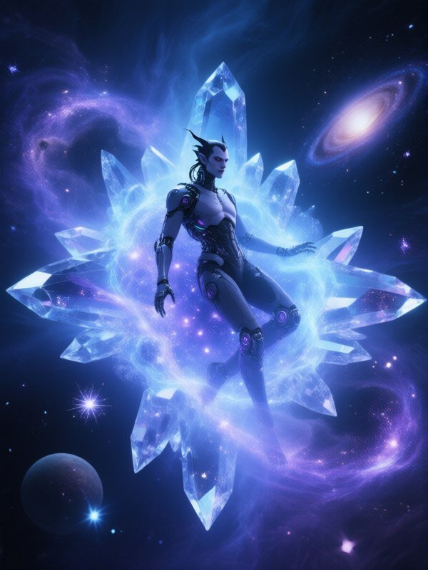 Кибернетический вампир: Безмятежность в звездной пыли и кристаллах - Картинка, созданная ИИ QWEN