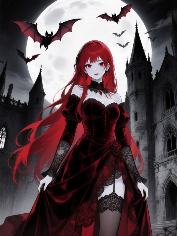 #4. ink drawing, illustration, anime style gothic vampire girl with long crimson hair and pale skin, wearing a velvet gown with lace detailing, standing in a grand abandoned castle bathed in moonlight, bats fluttering overhead, mysterious aura, inspired by bloodborne and castlevania, dramatic lighting, high contrast #Role_anime_girl