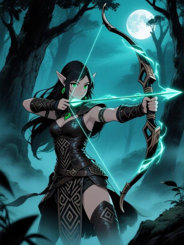 #2. ink drawing, illustration, anime style dark elven huntress with piercing emerald eyes, wearing leather armor embellished with intricate tribal patterns, wielding a recurve bow strung with shimmering energy, standing amidst an ancient forest shrouded in mist, moonlight filtering through the canopy, dynamic action pose, inspired by zelda and mass effect, dramatic shadows #Role_anime_girl