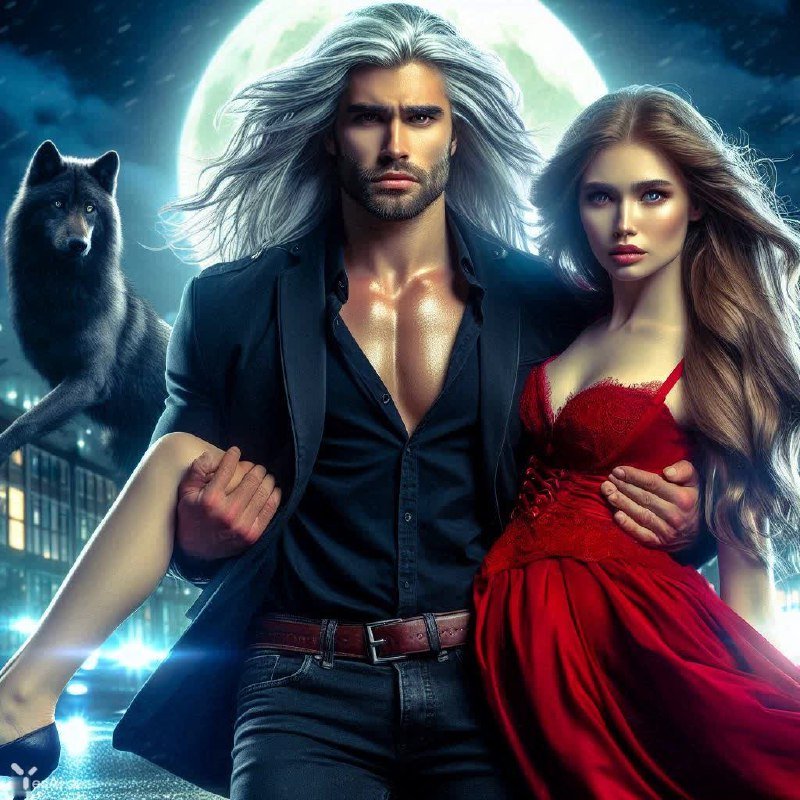 Realistic. A muscular 30-year-old man with long white hair and an imperious look, wearing a modern leather jacket and dark jeans, resolutely carries a 20-year-old woman with long blond hair, dressed in a red dress. Her gaze is full of trust, his is inflexible, both look at the viewer. Background: a night with a full moon illuminating a city park or a deserted street, the silhouette of a wolf visible against the sky, cinematic lighting, bright colors with blue and silver accents, epic and romantic atmosphere, hyperrealism, close-up, 1:1 -v 7