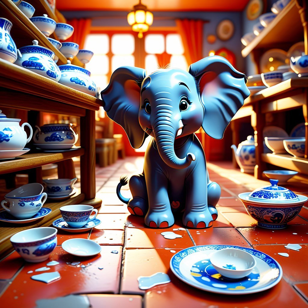 Сломанная посуда и веселый слон в китайском магазине - Картинка из нейросети Stable Diffusion