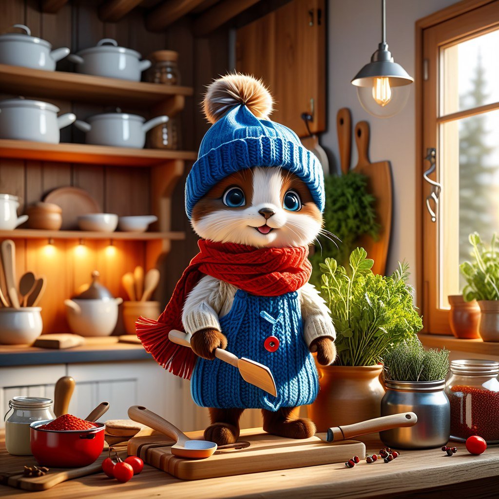 Милый антропоморфный зверек с большими блестящими глазами и голубой шерстью замер на кухонном столе в ожидании начала готовки. На нем уютная вязаная шапка с помпоном, красный шарф и бежевый фартук, создающие атмосферу домашнего тепла и уюта. В лапках он держит деревянный совок и круглую разделочную доску, а на мордочке играет теплая улыбка, словно говорящая о готовности к кулинарным подвигам. Вокруг царит атмосфера осенней сказки: теплые деревянные шкафчики, полные банок с заготовками и ароматных трав, наполняют пространство уютом и гостеприимством. Мягкий свет, проникающий сквозь окно, создает ощущение волшебства и домашнего очарования. Это невероятно детализированная трехмерная иллюстрация, выполненная в ультравысоком разрешении с использованием причудливого стиля и кинематографического освещения, что делает ее поистине завораживающей и передает всю прелесть момента готовки в самом сердце осеннего дома. Кажется, будто время остановилось, чтобы запечатлеть эту трогательную сцену домашнего счастья и кулинарного вдохновения