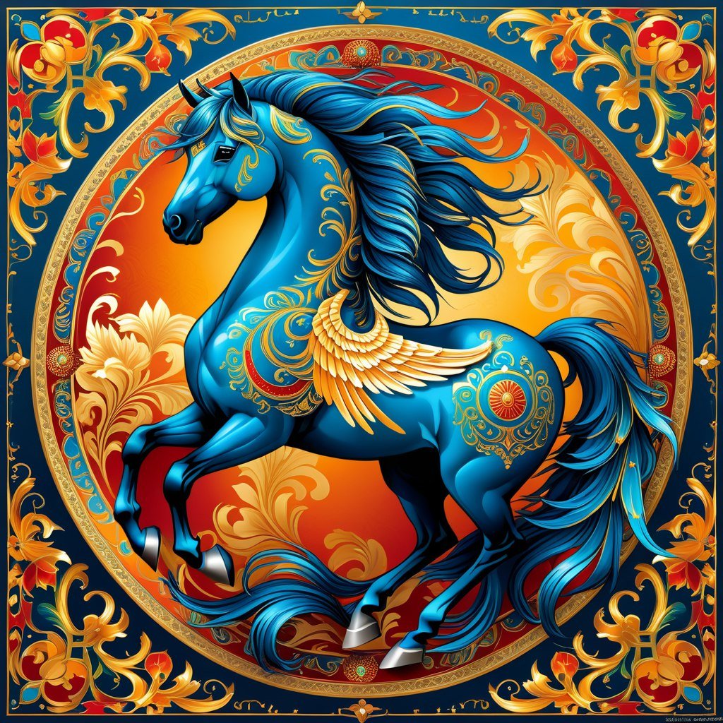 Представленный цифровой рисунок воссоздает величественный образ персидского коня в стиле сасанидов, вдохновленного традиционным узором крылатого коня Пегаса этой эпохи. Изображение выполнено в двухмерном формате и поражает детальной проработкой, подчеркивающей его царственное и мистическое величие. Яркие цвета и замысловатые орнаменты наполняют картину жизнью и энергией, создавая ощущение волшебства и роскоши. Особое внимание уделено изображению развевающихся гривы и хвоста коня, а также изящным крыльям, добавляющим ему небесной грации. Тело животного украшено богатой декорацией, свидетельствующей о высоком уровне мастерства художника. Вся композиция излучает благородство и пленительную загадочность, захватывая взгляд зрителя своей красотой и безупречным качеством исполнения. Это не просто изображение коня – это воплощение древней мифологии и символики, передающее дух эпохи сасанидов через призму современного цифрового искусства. Картина демонстрирует гармоничное сочетание реалистичности и фантазии, создавая неповторимый образ могущественного и прекрасного существа, достойного восхищения. Каждый элемент рисунка тщательно продуман и выполнен с любовью к деталям, что делает его настоящим произведением искусства