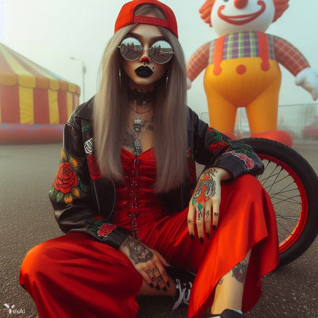 Завораживающая атмосфера тумана окутывает кадр, создавая ощущение нереальности и загадочности. В центре внимания – яркая и дерзкая девушка, воплощающая образ современной хулиганки с нотками бимбо. Ее стильный лук включает в себя светоотражающие серебряные круглые солнцезащитные очки, длинное красное платье, подчеркнутое ремнями упряжки, и сетчатые элементы, добавляющие образу пикантности. Сидя на колесе в черных кроссовках на платформе, она излучает уверенность и непокорность. Ее темные губы и изящный кошачий носик украшены оригинальным узором, а длинные прямые серые волосы контрастируют с красной шапкой-бини, исписанной комиксными надписями и радужными рисунками. На плече красуется татуировка – зловещий череп в окружении нежных роз, символизирующий сочетание силы и хрупкости. Необычным дополнением к этому сюрреалистическому пейзажу является надувной гигантский клоун, создающий игру теней и добавляющий кадра нотку абсурда. Фон цирка-шатра, прорисованный с невероятной детализацией в стиле ломографии, усиливает эффект театральности и загадочности. Фотография передает уникальную эстетику пленочной съемки, где зернистость и мягкость цветов создают неповторимую атмосферу ностальгии и мечтательности. Это портрет бунтарки, затерянной в туманном мире фантазий и ярких образов
