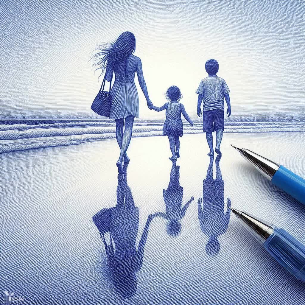 A blue ballpoint pen drawing of a rear view: a slender girl holding a small child's hand, and a child holding a man's hand, walking along a beach, is executed with precise, well-defined lines, using subtle shading and hatching for blending. By repeating the lines, create intricate details and subtle textures. The image should have a modern and sophisticated appearance, showcasing the precision that can be achieved with a simple pen.