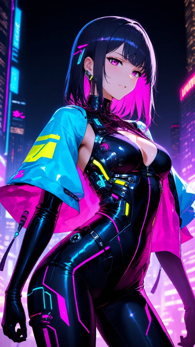 <lora:1914845:1>, anime, illustration, female cyberpunk model in avant-garde fashion, biomechanical elements with vibrant neon colors, poised in a dramatic stance, urban landscape background, high-contrast lighting emphasizing her features, whimsical yet powerful expression, full body art, #2 #Role_anime_girl