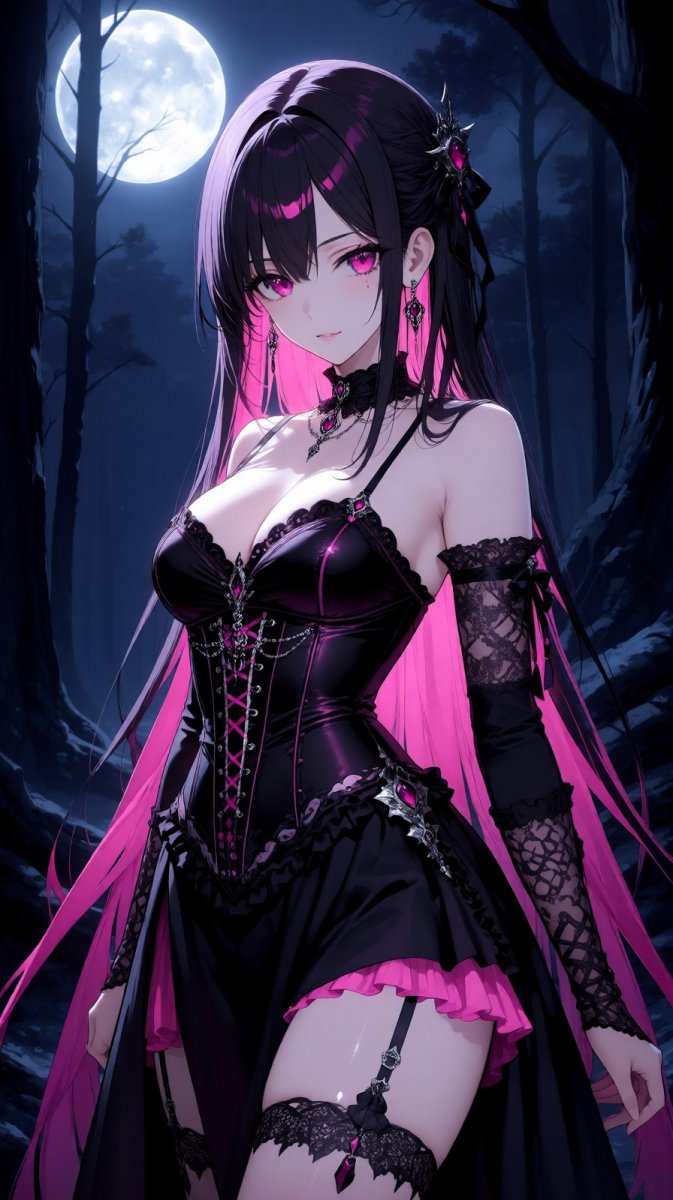 <lora:1914845:1>, anime, illustration, girl in black and pink corset-style costume, pale gothic beauty with striking accessories, striking pose with dramatic lighting, full body art, mysterious forest background with moonlight, intricate details on clothing, captivating expression, #4 #Role_anime_girl