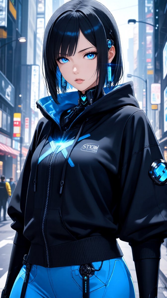 Завораживающий образ девушки-аниме, воплощенный в яркой иллюстрации. Перед зрителем предстает загадочная женщина в стильном костюме сочетании черного и синего цветов, излучающая силу и элегантность. Ее взгляд, пронзительный и глубокий, подчёркнут небесно-голубыми глазами, словно отражает бурю внутри. Образ вдохновлён легендарной Шторм из вселенной X-Men, но при этом представлен в совершенно новой интерпретации – как авангардная модель, одетая в футуристический биопанк гардероб. Сочетание элегантности и повседневного стиля создаёт уникальный контраст, подчеркивая её неповторимость. Реалистичная прорисовка деталей, особенно игра света на лице, добавляет глубины и реалистичности изображению. Фон – оживлённая городская улица, наполненная динамикой и энергией, придаёт сцене драматизма. Вся композиция создает впечатление о детально проработанном женском андроиде, сочетающем в себе красоту, силу и загадочность будущего. Эта иллюстрация - не просто изображение, а целая история, рассказанная через визуальные образы, захватывающая воображение и оставляющая неизгладимое впечатление. Она представляет собой гармоничное переплетение различных стилей и жанров, создавая неповторимый художественный эффект. Этот персонаж – воплощение силы духа, красоты и технологического прогресса, способное вдохновить на новые свершения