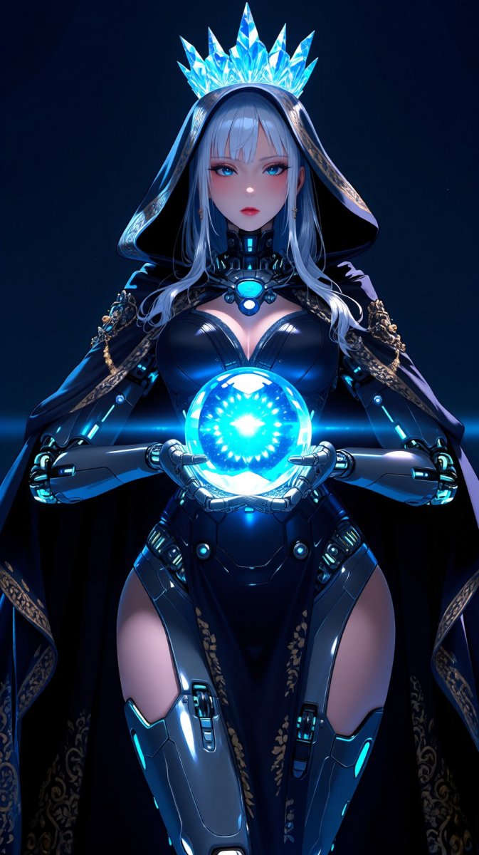 Иллюстрация, сгенерированная искусственным интеллектом Qwen Images, представляет собой яркий аниме-образ 'Холодной королевы', сочетающий элементы киберпанка и древней русской мифологии. Главная героиня – стильная кибернетическая механоида с русскими чертами, изображенная как могущественная некромантка. Она одета в темный плащ и держит в руках хрустальный шар, излучающий таинственный свет.