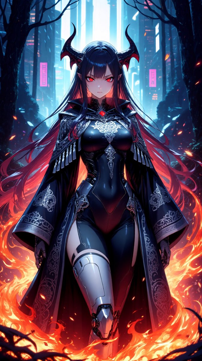 Завораживающая иллюстрация в стиле аниме демонстрирует могущественную демоницу, окруженную бушующим пламенем. Ее пленительные черты лица сочетают в себе красоту и кибернетические элементы, создавая уникальный образ футуристической соблазнительницы. Взгляд пронзительных красных глаз полон силы и загадочности, а длинные струящиеся волосы добавляют образу неземной шарма. Изысканный плащ с серебряными акцентами и узоры в русском стиле подчеркивают ее экзотическую принадлежность к мистическому миру. На фоне динамичного городского пейзажа, выполненного в ярких тонах, она предстает как воплощение мечты о киберпанковской девушке, обитающей в темном таинственном лесу. Высококачественная ультрадетализированная компьютерная графика передает реалистичность аниме-стиля и создает ощущение присутствия в волшебной вселенной. Мощная стойка и свирепый, но притягательный взгляд лишь усиливают впечатление от ее непревзойденной силы и очарования. Абстрактные формы на заднем плане добавляют композиции глубины и загадочности, погружая зрителя в атмосферу нереальности и мистики. Эта работа – настоящее произведение искусства, сочетающее в себе элементы фэнтези, киберпанка и традиционной русской культуры, создавая неповторимый визуальный опыт