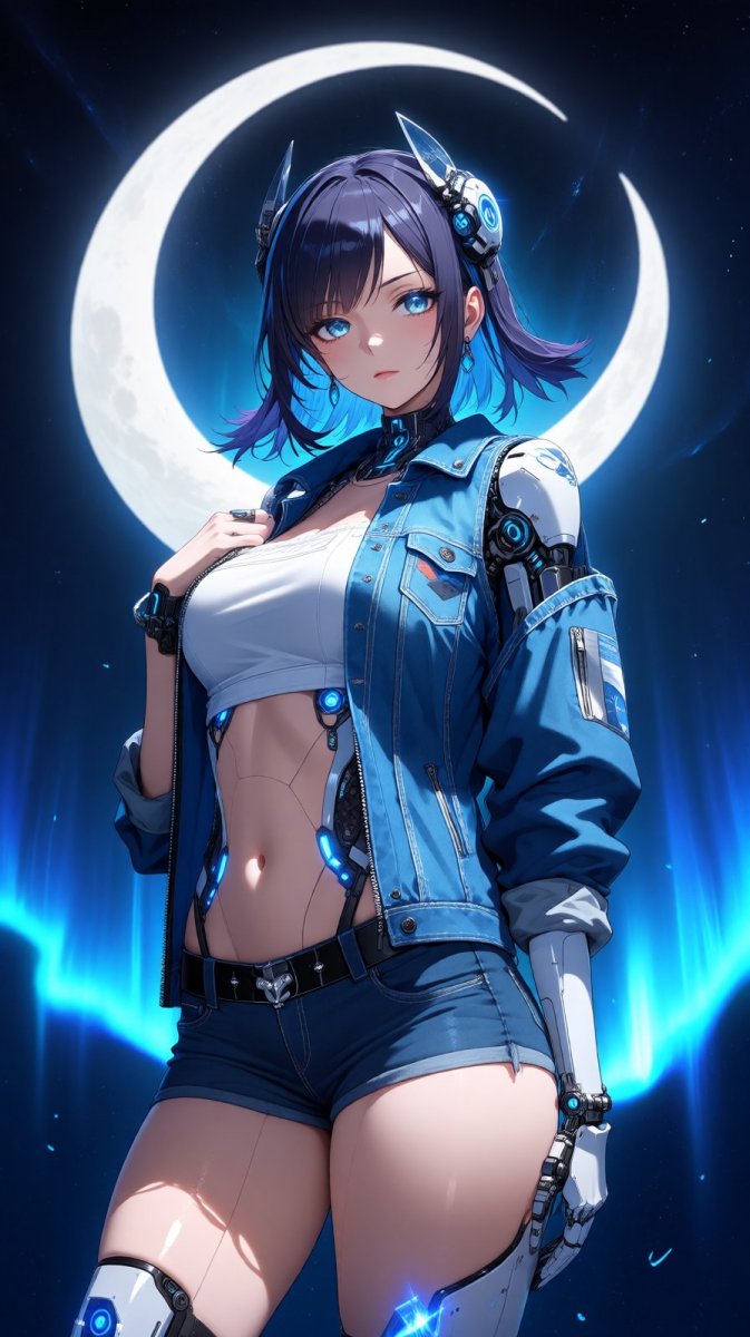 <lora:1914845:1>, anime, illustration fashionable cyberpunk mechanoid, avant-garde fashion model, biopunk futurist wardrobe, denim jacket, elegant casual style, blue aurora surrounding her, cgsociety 9, inspired by rias gremory, detailed clothing, soft moonlight illuminating scene, full body art, #role_anime_girl