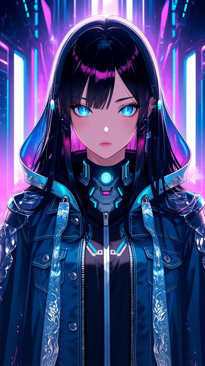 Яркая и детализированная иллюстрация в стиле аниме представляет собой девушку с длинными черными волосами, облаченную в стильный повседневный наряд, включающий джинсовую куртку. Ее образ дополнен сложным плащом, украшенным серебряными акцентами, придающими ему изысканность и загадочность. На лице девушки запечатлено выражение решимости и силы, подчеркивающее ее характер. В гардеробе прослеживается влияние биопанк-футуризма, что добавляет образу уникальности и оригинальности. Использование ярких цветов создает визуально привлекательный контраст и усиливает общее впечатление от иллюстрации. Симметричные пропорции фигуры девушки подчеркивают ее красоту и элегантность. Она выглядит как мечтательная киберпанковская девушка с завораживающими светящимися глазами, приковывающими взгляд зрителя. Изображение выполнено с использованием техники резкой фокусировки, что обеспечивает максимальную детализацию и четкость каждой линии и элемента. Этот образ воплощает собой сочетание аниме-эстетики, модных тенденций будущего и сильного характера главной героини, создавая неповторимую атмосферу загадочности и приключения в мире киберпанка. Девушка излучает уверенность и готовность к любым вызовам благодаря выразительному взгляду и стильному наряду, сочетающему в себе элементы повседневной одежды и футуристической брони. Ее изображение станет прекрасным дополнением для любого проекта, связанного с аниме, киберпанком или фантастическим миром