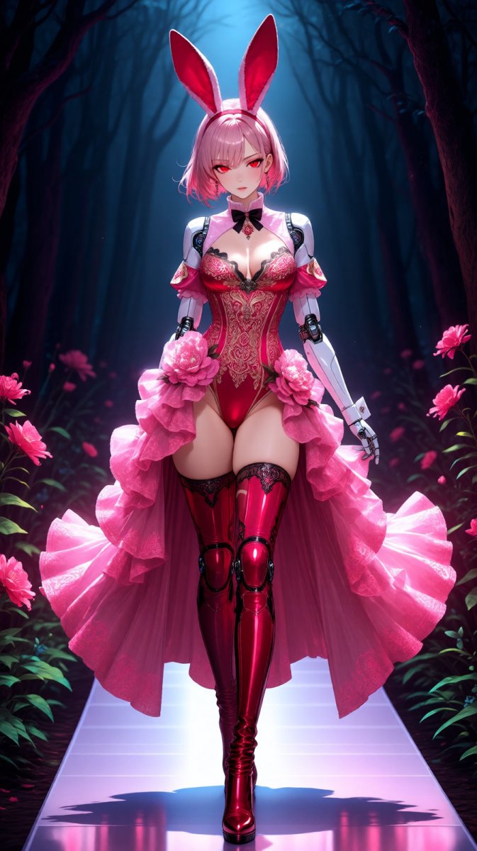 <lora:1914845:1>, anime, illustration woman in pink dress walking down runway, striking red eyes, ornate patterns in russian style, gothic bunny costume bodysuit, beautiful alluring female cyborg, delicate bloom effect, dark mystical forest bg, high heel boots, professional, octane rendering, #role_anime_girl