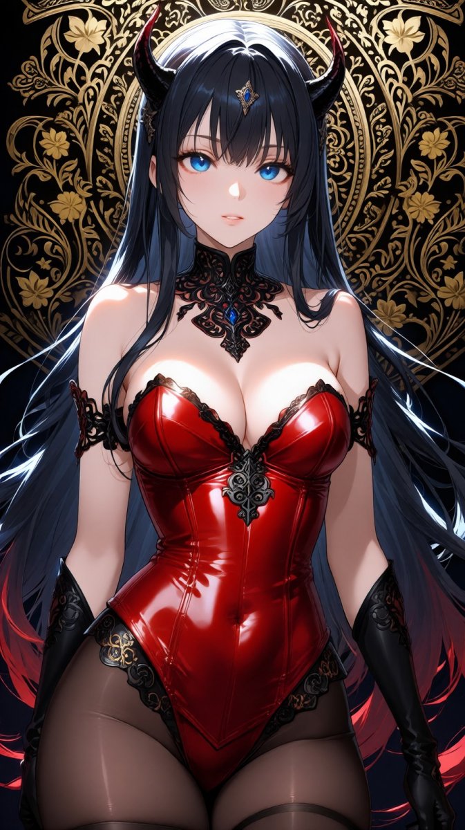 <lora:1914845:1>, anime, illustration girl with blue eyes, demon girl with long hair, woman in red leather corset, bunny costume bodysuit, russian woman ancient russian mythology complex filigree floral ornament black gold, trending on artshion fashion fantasy, cgi, dynamic illumination and shadow, #role_anime_girl