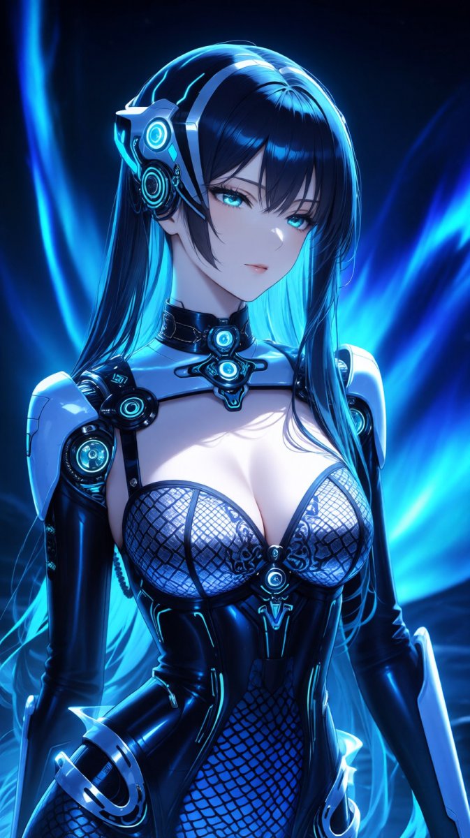Элегантная кибернетическая воительница в образе футуристической модели. Эта завораживающая иллюстрация демонстрирует невероятную красоту и технологическое совершенство. Девушка с длинными струящимися волосами окружена мерцающим синим сиянием, напоминающим северное свечение. Её образ дополнен стильным киберпанк-механоидом и смелым сочетанием модных тенденций. Особое внимание привлекает изысканный корсет из рыболовной сетки с чокером, украшенный сложными узорами. Реалистично прорисованная одежда, подчёркнутая интенсивным динамичным освещением и тенями, придает изображению глубину и объём. Фон окутан загадочной атмосферой, создавая ощущение эфирности и мистицизма. Эта работа представляет собой гармоничное сочетание аниме-эстетики, реалистичной детализации и инновационного дизайна. Использование студийного освещения подчеркивает красоту модели, делая её центром внимания. Яркий пример современного цифрового искусства, демонстрирующий мастерство художника в создании захватывающих визуальных образов. Погружение в мир высоких технологий и фантазий, воплощённое в этом потрясающем произведении