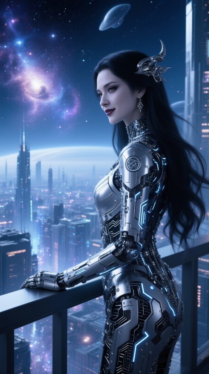 #4 Elegant Vampiric CYBORG | Astral Being, adorned with intricate silver circuitry interwoven within her flowing dark hair, observes the glittering expanse of a nebular cityscape from a balcony overlooking an alien metropolis, a serene and slightly detached smile playing on her lips😌.