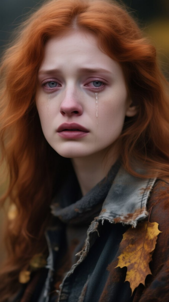 Изображение представляет собой эмоциональный портрет русской модели с огненными волосами и серыми глазами, выполненный в стиле гранж и напоминающий кадр из кино. Атмосфера пронизана осенней меланхолией и печалью, подчёркнутой задумчивой музыкой и звуками слез. Используется богатая цветовая палитра с приглушенным светом и кинематографической подачей через объектив 85mm и мягкий фокус, что создаёт ощущение ностальгии и увядающей красоты.