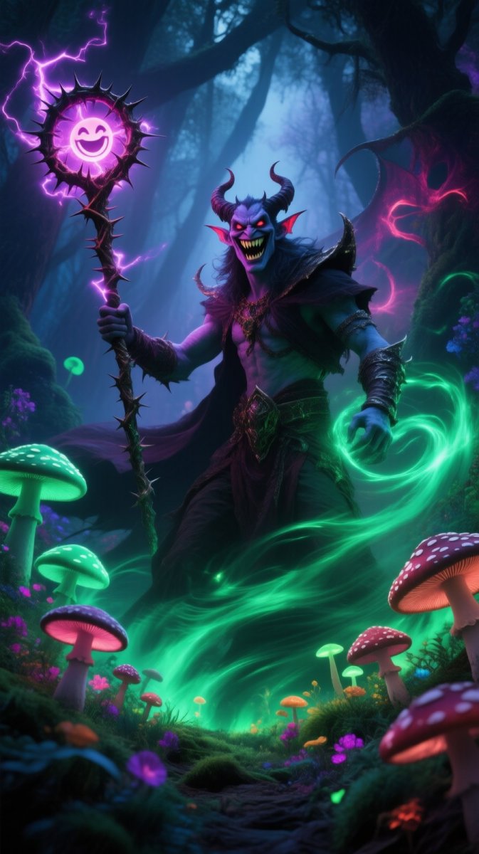 #2. A fearsome Demon Lord | Fey Trickster, wielding a thorny scepter pulsing with chaotic energy, dances amidst a grove of bioluminescent fungi in an otherworldly forest, his mischievous grin 😜 reflecting in the pulsating light as he conjures illusions and traps unsuspecting travelers, a whirlwind of shadows and vibrant flora swirling around him, revealing glimpses of both infernal power and playful cunning. #Role_ChaosWeaver