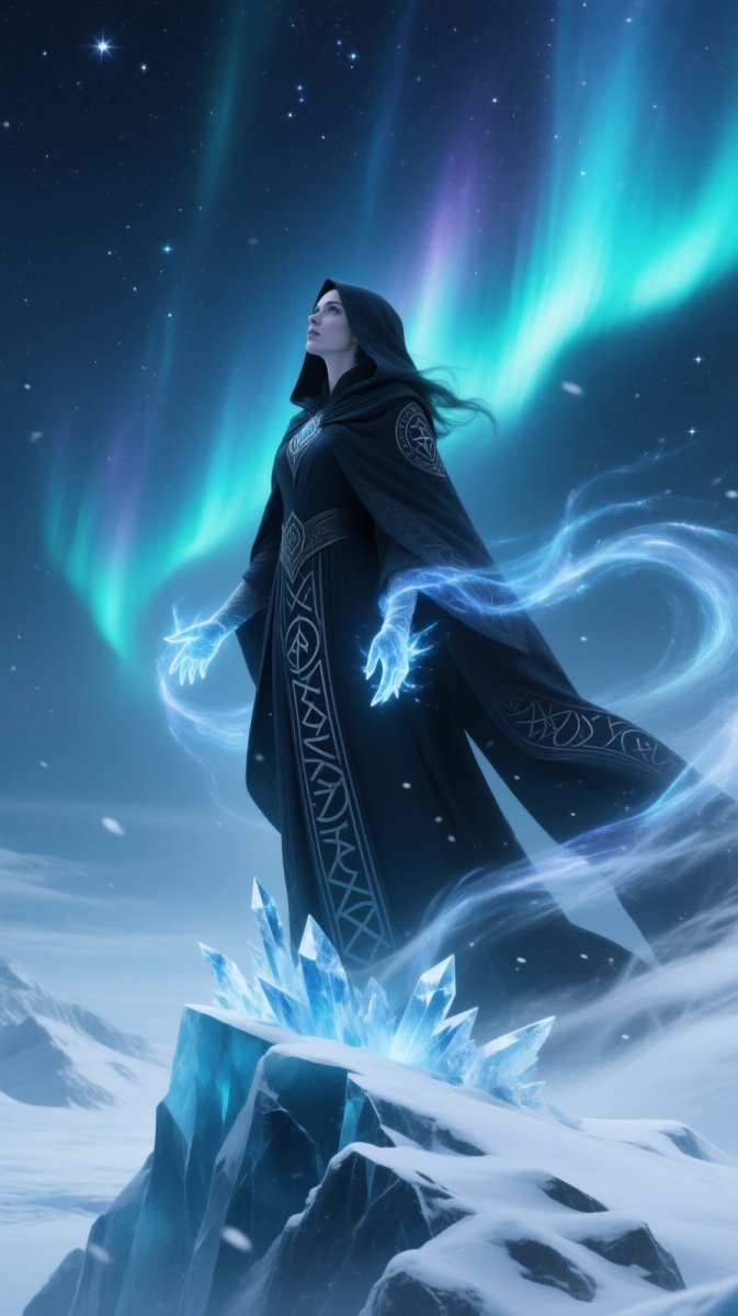 #1. A mesmerizing Shadowmancer | Arctic Seer, cloaked in swirling aurora borealis energy and etched with ancient runes, stands atop a glacial peak, gazing into the infinite expanse of frozen stars, her expression a thoughtful 🧐 as spectral ice crystals form around her fingertips, weaving illusions of forgotten realms, while windswept snow highlights the intricate patterns of her dark robes. #Role_Cryomancer