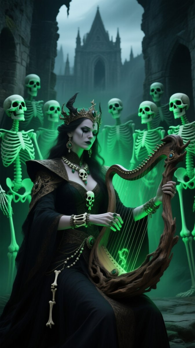 #3. A regal Necromancer | Mythic Bard, adorned with bone jewelry and playing an ancient lyre crafted from petrified wood, commands a spectral choir of animated skeletons in the ruins of a forgotten kingdom, her solemn expression 😞 illuminated by the eerie green glow emanating from their empty sockets as she weaves haunting melodies that bind souls to her will, evoking echoes of past glories and impending doom. #Role_SoulReaper