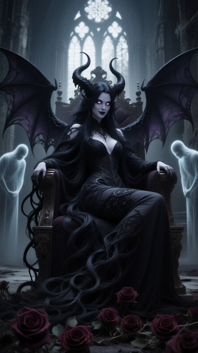 #1 A hauntingly beautiful Succubus (Succubus | Shadowmancer), adorned with intricate shadow tendrils woven into her long, obsidian hair and manifesting as ethereal wings 🖤, lounges upon a throne of petrified roses within a decaying gothic cathedral, her eyes glowing faintly amidst the gloom while she displays a subtle, knowing smirk 😏 as spectral figures bow before her. #Role_Succubus