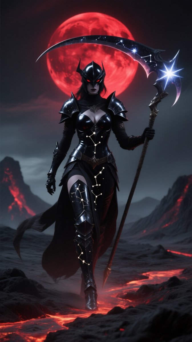 #3 A formidable Nightwalker (Nightwalker | Warrior), clad in polished obsidian armor etched with constellations and wielding a scythe forged from solidified starlight, strides through a desolate volcanic landscape beneath a blood-red moon, her face partially obscured by a shadowed helm, but a hint of steely determination visible 😠. #Role_Guardian