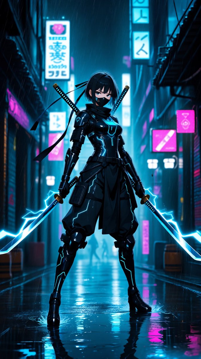 <lora:1914845:1>, anime, illustration cyberpunk ninja girl clad in sleek black armor augmented with neon blue circuitry, wielding dual katanas that shimmer with electric arcs, standing amidst a rain-slicked Tokyo alleyway, vibrant holographic advertisements illuminating the scene, gritty realism blended with futuristic fantasy elements, full body, action pose #Role_anime_girl