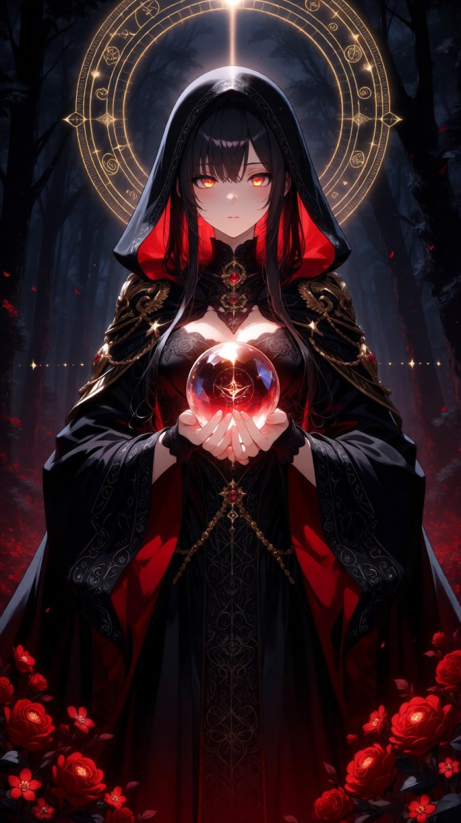 <lora:1914845:1>, anime, illustration beautiful necromincer girl in dark cloak holding crystal ball, enchanting features, mystic aura, glowing eyes, intricate details on cloak, surrounded by arcane symbols, ethereal light illuminating face, dark mystical forest bg, floral ornament, black red gold, cgsociety 9, lilith vibes, sharp focus #Role_anime_girl