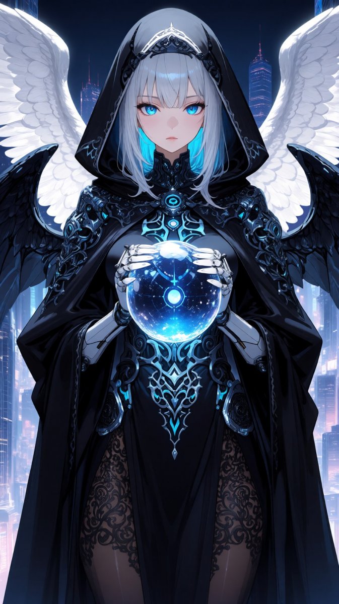 <lora:1914845:1>, anime, illustration beautiful necromincer girl in dark cloak holding crystal ball, fashion of future, fashionable cyberpunk mechanoid, angelic white wings and dark black wings, complex filigree, studio light, professional, russian woman, intense blue eyes, ornate patterns, avant-garde fashion model, bg is cityscape, trending on artshion fashion fantasy #Role_anime_girl