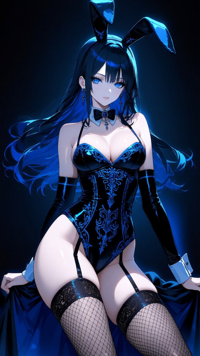 Иллюстрация в стиле аниме представляет собой образ готической красавицы, выполненный в психобилли эстетике с элементами бурлеска. Девушка одета в эффектный костюм черного и синего цветов, включающий боди с заячьими ушками, готический топ, рыболовный корсет и чокер. Акцент сделан на деталях: орнаменты, тонкие линии, бледная кожа, динамическое освещение и игра теней создают драматичный эффект.