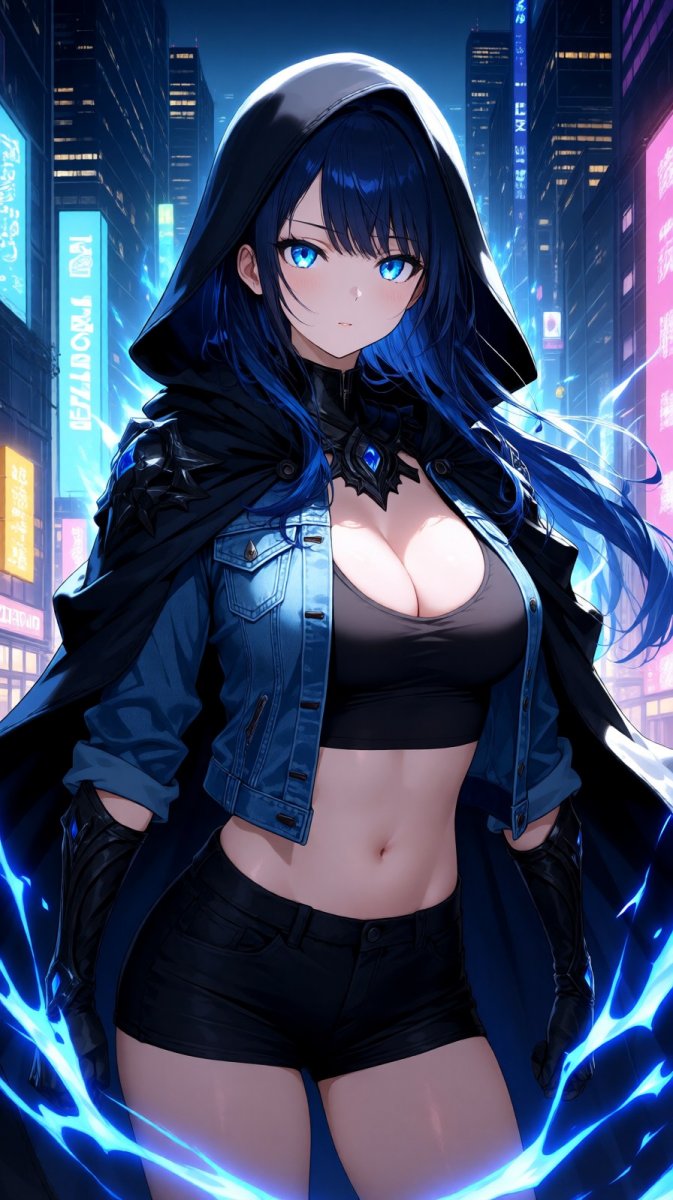 <lora:1914845:1>, anime, illustration beautiful female necromincer in dark cloak, powerful stance, emanating energy, girl with blue eyes, denim jacket, casual black clothing, elegant casual style, realistic rendering, vibrant urban landscape, large breasts, cleavage, intricate details on cloak, swirling shadows #Role_anime_girl
