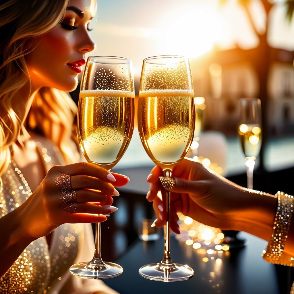 Изображение пронизано ощущением легкости, воздушности и шикарного блеска, передающим атмосферу праздника и роскоши. Каждое пятно цвета вносит свой вклад в создание общего впечатления сияния и элегантности. Работа дышит утонченностью и радостью жизни, представляя собой визуальную оду красоте и изысканным удовольствиям, созданную с помощью ИИ (DreamFusion), используя сэмплер Euler a. Акцент сделан на деталях: форме бокала, игре солнечного света на пузырьках шампанского – все элементы способствуют созданию атмосферы беззаботности и неповторимого очарования, приглашая зрителя в мир прекрасных грез.