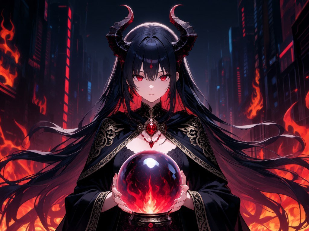 <lora:1914845:1>, anime, illustration beautiful necromincer girl in dark cloak holding crystal ball, enchanting features, intricate red jewelry, wings, demonic hellfire, vibrant urban landscape, detailed cg artwork, high quality, ethereal and mystical bg is dark, flowing hair, ornate patterns, sharp focus, dramatic pose #Role_anime_girl