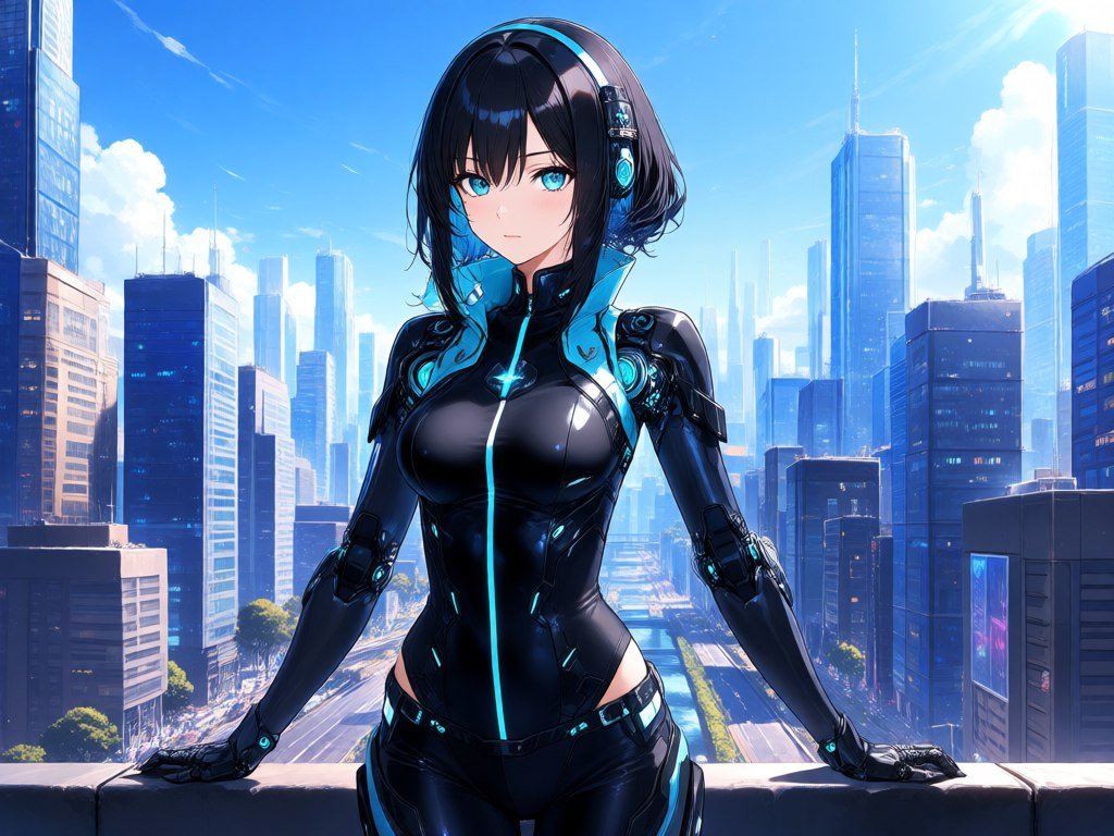 <lora:1914845:1>, anime, illustration beautiful alluring female cyborg standing in front of cityscape, inspired by rias gremory, black and blue costume, powerful stance, artstation trend, vibrant urban landscape, realisitcly rendered clothing #Role_anime_girl