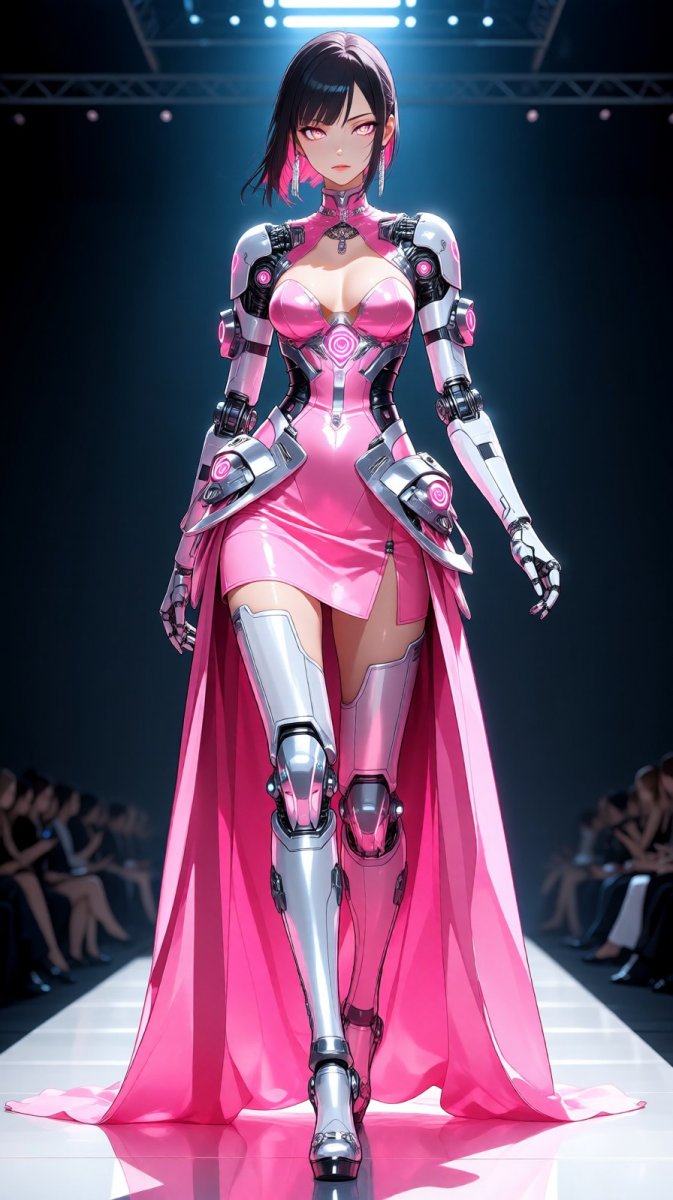 <lora:1914845:1>, anime, illustration fashionable cyberpunk mechanoid in pink dress walking down runway, avant-garde fashion model, biopunk futurist wardrobe, fierce and alluring expression, glowing eyes, silver accents, realistic anime style, studio light, clear proportions #Role_anime_girl