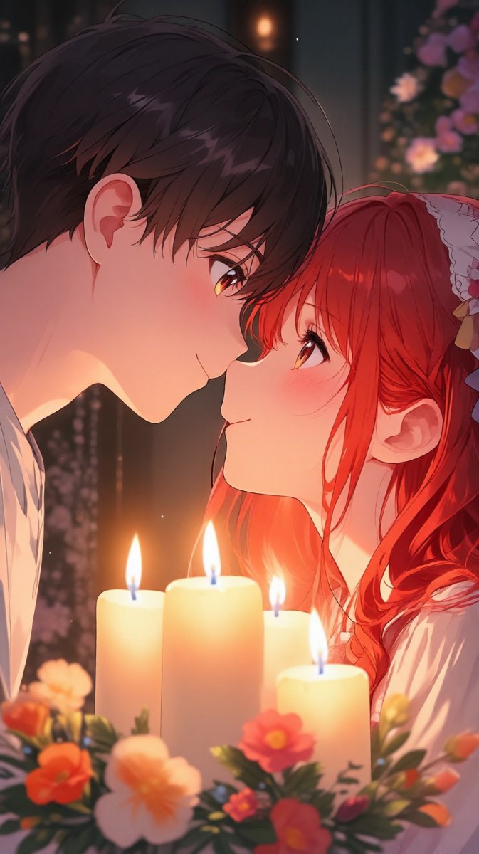 #4 <lora:1914845:1>, anime, illustration, boy and red-haired girl sharing a tender moment with candles illuminating their faces, cozy atmosphere, soft blush on their cheeks, floral arrangements around, delicate details in their clothing, ethereal light #Role_anime_girl