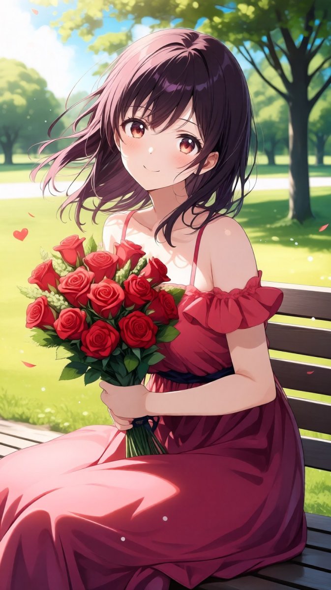 #4 <lora:1914845:1>, anime, illustration, ry-haired girl with bouquet of red roses, wearing a summer gown, sitting on a park bench, gentle wind blowing through her hair, sparkling expression, serene natural background, high quality details, romantic ambiance #Role_anime_girl