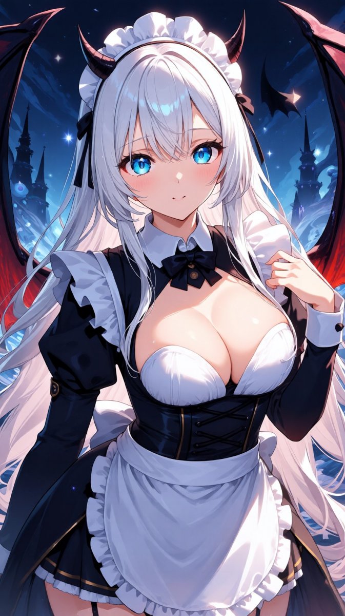 <lora:1914845:1>, anime, illustration, demon girl with blue eyes, long white hair, wearing maid uniform, full body, large bust, enticing expression, intricate details on outfit, dynamic lighting highlighting her features, BG is whimsical fantasy setting, #1 #Role_anime_girl