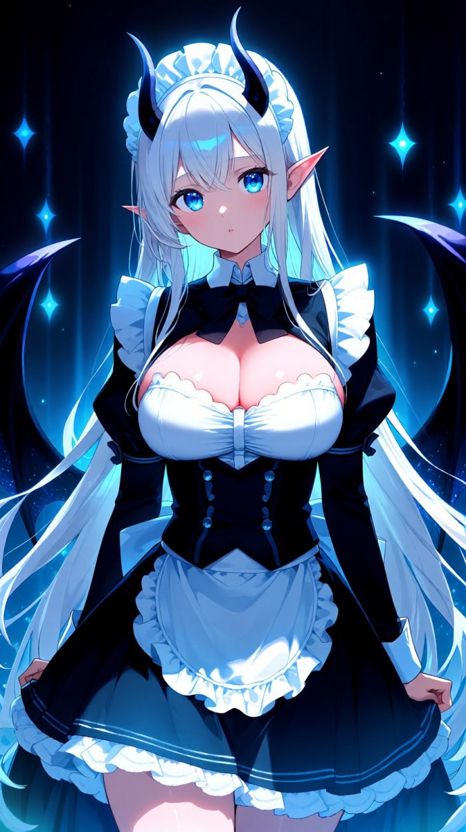 #4 <lora:1914845:1>, anime, illustration, beautiful demon maid in striking uniform, large bosom, shimmering blue eyes, long white hair, captivating expression, atmospheric lighting effects, BG is shadowy and enchanted #Role_anime_girl