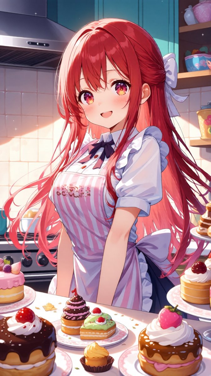 <lora:1914845:1>, anime, illustration, girl with long flowing red hair, surrounded by colorful pastries and desserts, wearing a cute apron, vibrant kitchen setting, sparkling eyes, cheerful expression, whimsical atmosphere, dynamic lighting highlighting her features, full body art, pastel color palette, BG is cozy and inviting #Role_anime_girl