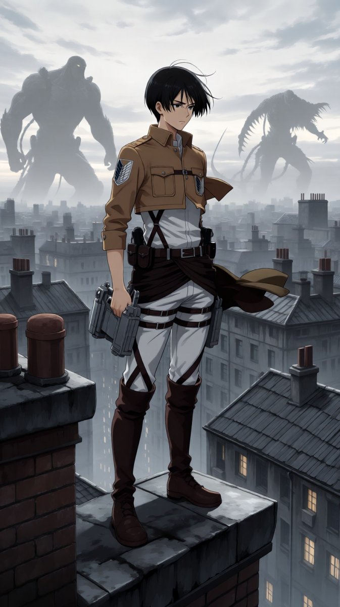 Леви Аккерман: Безмятежность на крыше в мрачной атмосфере атаки титанов - Картинка, сгенерированная нейросетью Qwen Ai Images