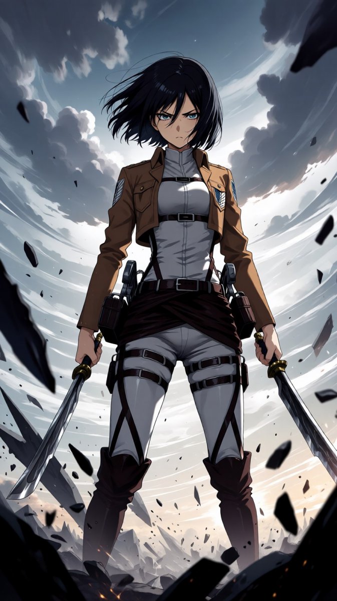 #3 <lora:1914845:1>, Anime, Illustration, Masterpiece, Newest, Sensitive, 1girl, (Mikasa Ackerman \(Attack on Titan\): 1.1), Attack on Titan, (Fuzichoco: 0.9), (Mola Mola: 1.15), Solo, In a Battle Stance, Wearing a Tight-Fitting Survey Corps Uniform, Short Black Hair, Intense Gaze, Dual Blades Drawn, Surrounded by Debris, Determination in Her Eyes, Scary Yet Powerful Atmosphere, Wind Blowing, Cloudy Sky, Dramatic Lighting, Depiction of Strength. #Role_Genshin_impact