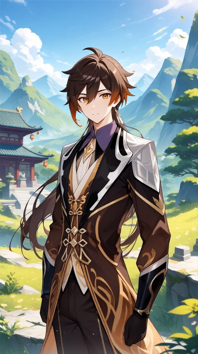 <lora:1914845:1>, anime, illustration, masterpiece, newest, sensitive, 1boy, (zhongli \ (genshin impact\): 1.1), genshin impact, (mola mola: 1.15), (fuzichoco: 0.9), solo, daytime, looking at viewer, wearing a traditional attire with earth tones, long dark brown hair, calm expression, standing in the middle of a vibrant landscape, mountains in the background, details of ancient architecture, serene atmosphere, polished stone, gentle wind, relaxed posture, surrounded by gentle light, classic elegance, nature elements, magnificent sky. #Role_Genshin_impact