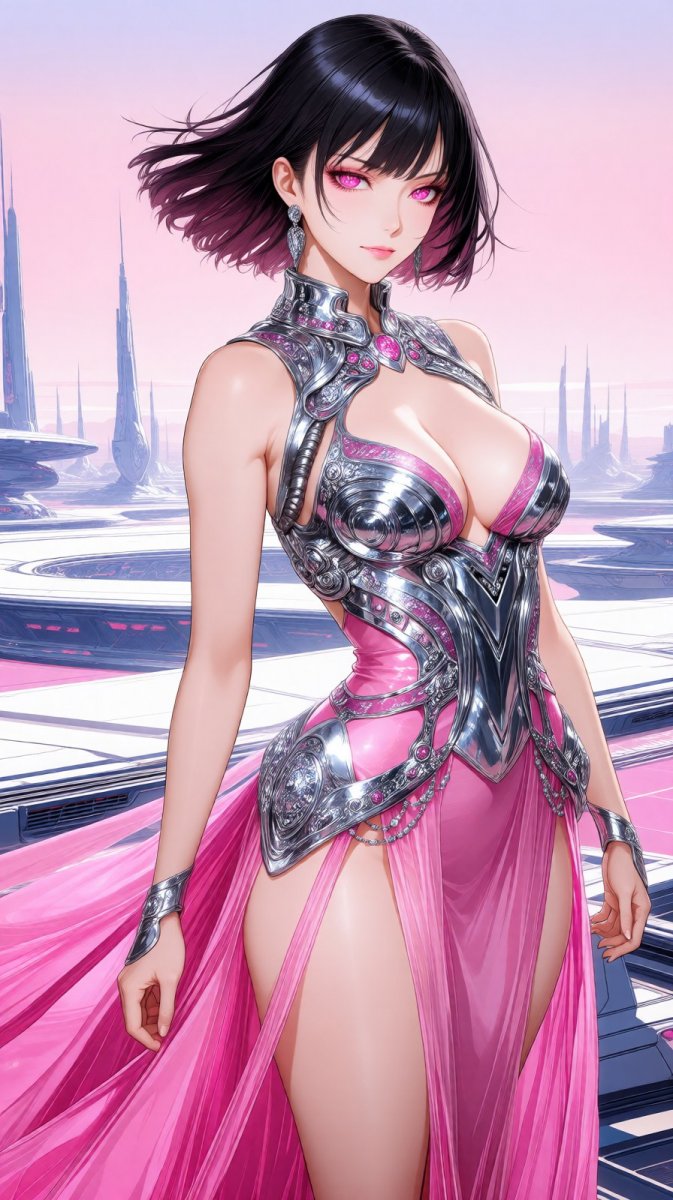 Изящная футуристическая андроида в розовом платье, украшенном хромированными акцентами, восхищает своей красотой и силой на фоне пастельно-окрашенного пейзажа будущего. Иллюстрация выполнена в стиле максималистской моды, подчеркивая элегантность и мощь персонажа. В образе чувствуется влияние творчества Алекса Росса и вдохновение работами Хитоши Сатояма – мастера гиперреалистичной и футуристической эстетики. Яркие розовые глаза андроида притягивают взгляд, а плавные линии платья создают ощущение движения и легкости. Детализированная проработка хромированных элементов добавляет образу технологичности и современности. Пастельный фон создает мягкий контраст с яркими деталями костюма и волос персонажа, подчеркивая ее необычность и привлекательность. Этот визуальный шедевр сочетает в себе элементы научной фантастики, высокой моды и искусства, создавая неповторимую атмосферу элегантности и технологического прогресса. В целом, изображение представляет собой стильное и запоминающееся воплощение идеальной андроидной красавицы, готовой покорить мир своей красотой и силой. Этот образ идеально подходит для обложек журналов о моде будущего или в качестве иллюстрации к научно-фантастическому роману
