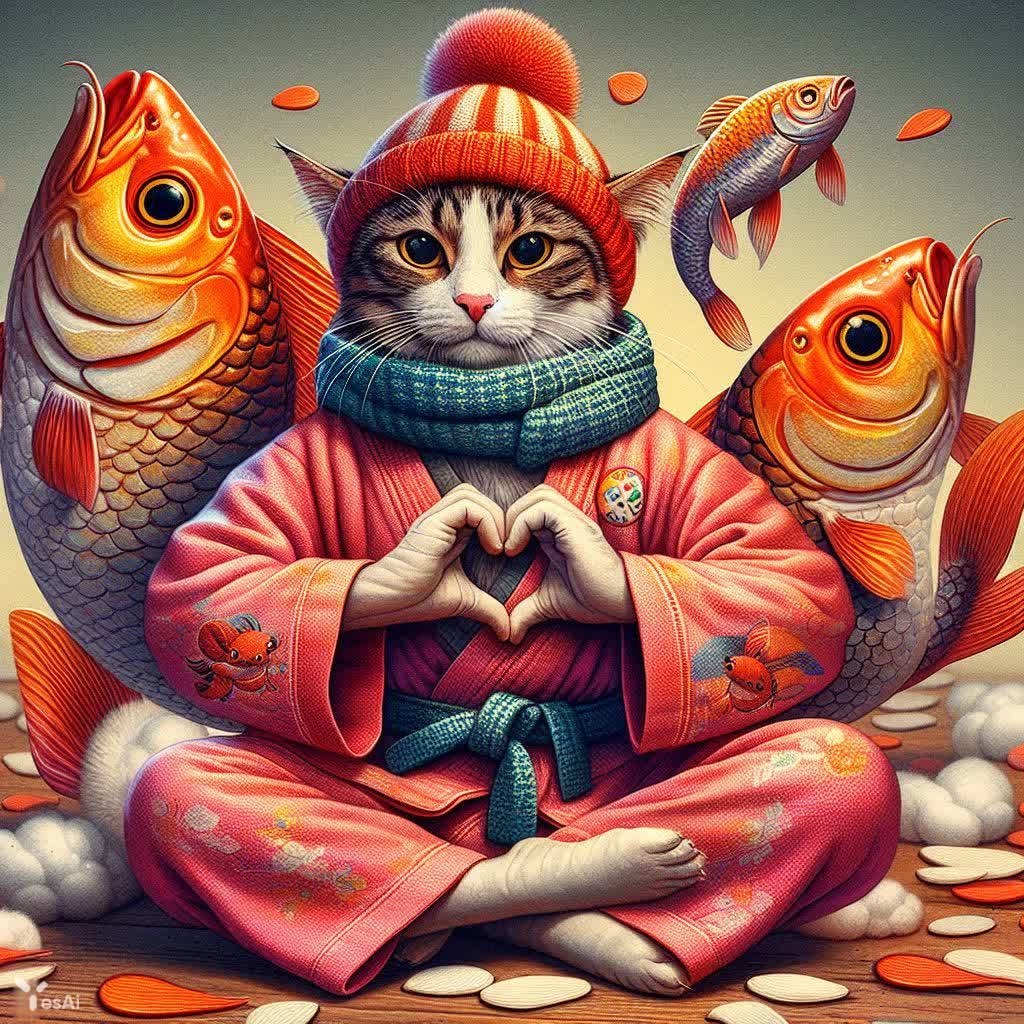 Изображение, созданное нейросетью Dalle, представляет собой сюрреалистическую сцену, где милый котик, одетый в кимоно каратиста, ушанку и шарф, демонстрирует боевое искусство прямо в ванной комнате. Вокруг него раскинулись пушистые кусты хлопка, создавая атмосферу сказочного тепла и безмятежности. Картина сочетает нежность кошачьего характера с силой карате и домашним уютом, вызывая ощущение фантастического настроения и абсурда. Это визуальная метафора, передающая послание о том, что вдохновение и радость можно найти даже в обыденных местах, а сила может проявляться в самых неожиданных формах. Рисунок выполнен в стиле ComicBook и демонстрирует философское размышление о гармонии противоположностей и природе реальности, подчеркивая миловидность котика и причудливость ситуации с любовью к деталям. В качестве промта использовалось описание сюрреалистических занятий карате в ванной с применением теплых вещей, где котик изображен показывающим жест сердечка руками.